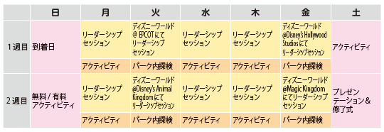 | コース内容 | 月~金(午前):リーダーシップセッション 2週間の研修期間で授業や実践的なワークショップを通してリーダーシップとイノベーションを深く学びます。 ディズニー・プロフェッショナルや業界の専門家による特別セッションも含まれ、4大パークの舞台裏も探検します。 【学べること】 ・リーダーシップの原則を探究し、自身の強みを発見。 ・ディズニーの総合的プロセスを通じて物語の伝え方やデザイン思考を体験。 ・協働、コミュニケーション、多様性のあるチームを築く方法を理解。 ・計画立案、問題解決などビジネススキルを実践。 ・テクノロジーやエンジニアリングが没入型体験をどのように高めているかを分析。 ・人前で話す力やプレゼンテーション力 ・参加型のグループ課題を通じて信頼関係とチームワークを築く。 月~金(午後):アクティビティ 研修施設または施設外でのアクティビティ(現地にてご案内) 土・日:終日アクティビティ 終日アクティビティ(有料または無料)に参加します。※現地申込み/支払い ※2週目はプレゼンテーション&修了式 |